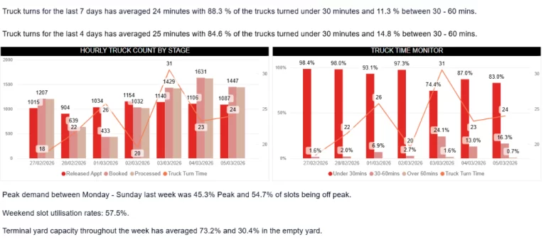 On Dock empty gate is open Saturday 0001-1500hrs, Sunday 0700-1500hrs, reopening Monday 0700hrs – thereafter 24 hrs.